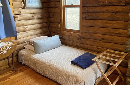 This magnificent two-story log cabin has two large sitting rooms, dining area, robust kitchenette with mid-size refrigerator, sinks, toaster oven, induction hot plate, coffee pot and kettle. There are three custom built fireplaces, one in each sitting room, and one upstairs in the suite. The upstairs suite is charmingly appointed with a queen size bed and a private bathroom that boasts a luxurious, old fashioned clawfoot tub with curtain & shower. The second bedroom on the ground floor has a twin size bed. There is an additional queen size convertible sofa in the TV room, a queen size futon in the living room, and a convertible twin size chair in the living room.