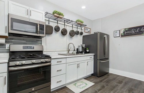 Whip up your favorite meal in our well equipped kitchen. We provide pots, pans, dinnerware, drinkware utensils, coffee and even a DIY waffle breakfast for your first day. You can at at the breakfast bar or in the spacious dining room with seating for 4. You could even use the dining room as your very own home office.