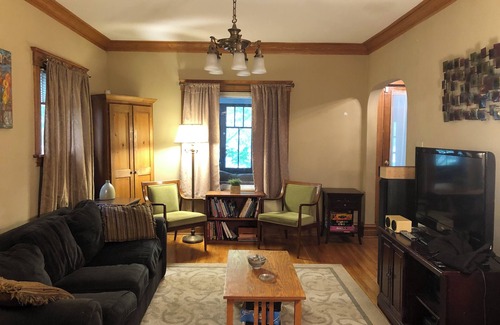Oak Park home with transitional decor. Amenities include kitchen with oven, 2 fridges, microwave, hot pot, rice cooker, popcorn popper, chocolate fountain, fondue pot, and cookie cutters! The dining room is formal and spacious. The living room had electronic and dozens of board games. The bedroom overlooks a garden. Work and study in the office with printer. Read or nap on the sunny front porch. Our place is blocks away from iconic Frank Lloyd Wright architecture.
