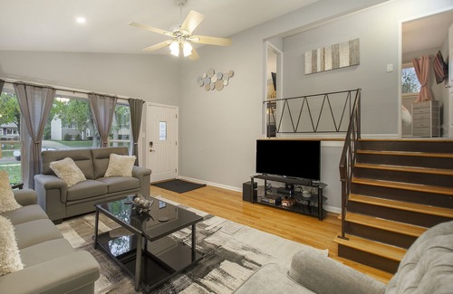 1700 SF renovated unit is 21 min away from downtown Naperville, which is like a bustling mini-Chicago, including a beach and plenty of bars/restaurants! This property has 3 bedrooms, & 2 bathrooms. Master bedroom has A KING BED, 2 Bedrooms have a Queen. 1 air mattress on-site (Total of 4 beds). Plenty of Kitchen utensils, all you need in a kitchen, including cooking spices and oils! Children friendly & lots of technology!