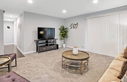 1600 SF renovated unit is 3-4 min away from interstate 355, and 20 minutes to O’Hare Airport! This property has 3 bedrooms, & 2 bathrooms. Master suite has a KING, and 2 bedrooms have a Queen. The living room has room for 1 air mattress (Total of 4 beds). Plenty of Kitchen utensils, all you need in a kitchen, including cooking spices and oils! Children friendly & lots of technology!