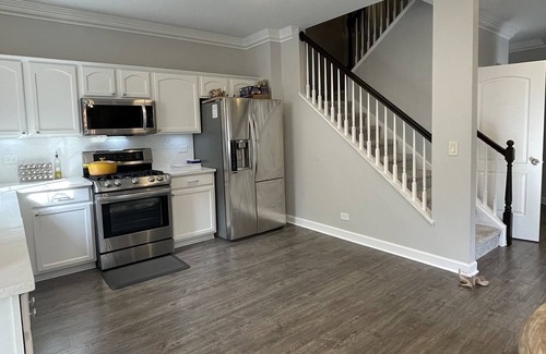 Modern Townhome with a theater room & gym area is located in Elgin. Modern Townhome with a theater room & gym area provides accommodation, featuring Air Conditioner, Security/Safety, Bedding/Linens, among other amenities. This House features Air Conditioner, Security/Safety, Bedding/Linens, to make your stay a comfortable one.