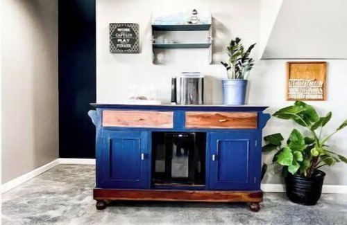 Downstairs a bar with mini wine fridge, Countertop ice maker, 2 oversized bean bag chairs, 2 pier one import chairs, sleeper couch bedding can be provided if need be for addl sleeping, 55” Roku tv w extension bar to plug in your fav game council, cards & board games, books, & plenty of extra space, full bath with standup shower, washer & dryer.