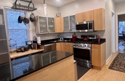 Stylish and comfortable on a premier residential block that has multi-million dollar homes in Chicago's popular North Center neighborhood. Wonderful vintage character with original oak moldings, yet a fully furnished modern kitchen and bath with newer stainless appliances, Nest controlled thermostat, free Wi-Fi & beautifully landscaped garden. Office desk can be adjusted electronically to a standup desk and has built in USB ports. Super convenient location, 0.3 miles to train, buses, Starbucks, restaurants, bars, boutiques, breweries. 20 minute walk to Wrigley Field & downtown.