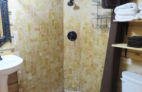 Hickory Hollow log cabin is an Amish built log cabin that will sleep 2 to 4 people comfortably, has a tumbled marble shower, a staircase to the open loft with 1 queen size bed. The futon in the living area folds out to a comfortable queen size bed. The kitchen is equipped with an apartment size refrigerator, stove/oven, microwave, toaster, coffee pot and all the dishes you'll need. We supply complimentary coffee, coffee filters, cream, sugar packets, salt, pepper, hand soap, dish soap, toilet paper, paper towels, firewood and camp chairs and of course, FREE WiFi.