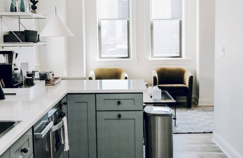 5th Floor Modern + Vintage Walkup with North, West, and South Views. A refreshing, sophisticated oasis with added flare like vibrant, oversized works of Chicago memorabilia. Ideal for a family or group of friends, this suite sleeps 7 between 1 King Bedroom + 1 Queen Bedroom, 1 Full Bedroom, & 2 full bathrooms. A stocked kitchen is on hand to cook a meal (or simply request a chef, you’re on vacay after all) and serene bathrooms complete with luxury bath products feels like home. Yoga mats aid a good sweat while your own washer + dryer keep things fresh. Sleep6 brand mattresses and supple linens allow for an optimal night’s rest. A washer + dryer, Sonos, YouTubeTV, and fast Wi-Fi add to the ease and comfort.